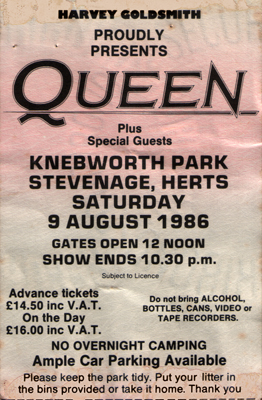 El concierto de Queen el 9 de agosto de 1986 habría pasado igualmente a la historia por la interminable marea humana de más de 120.000 personas que desafiaba a la lógica abarrotando hasta límites desaconsejables el Knebworth Park, una amplia zona verde en la localidad de Stevenage, al norte de Londres, a la que los músicos tuvieron que llegar en helicóptero para salvar el monumental atasco.